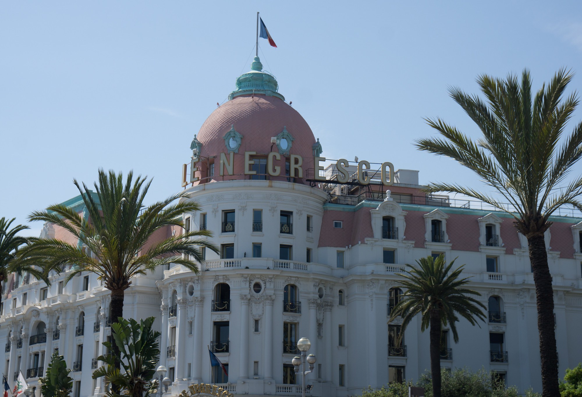After a few calls, Charles got the water situation resolved. Fortunately, it appears that someone just shut off the water to the apartment while it was not in use and failed to tell the other staff members that it would need to be turned back on. After getting cleaned up (and cooled off – it would seem that air conditioning isn’t as prevalent here as in the US), we set out to stroll the Promenade de Anglais and surrounding area. The sun was pretty warm, but the scene picturesque. The Mediterranean Sea is a beautiful azure (as in Cote d’Azur) and the people-watching was just as good. We will likely take another stroll down the promenade later in the trip and provide better details when we are not so disoriented from our lack of sleep.