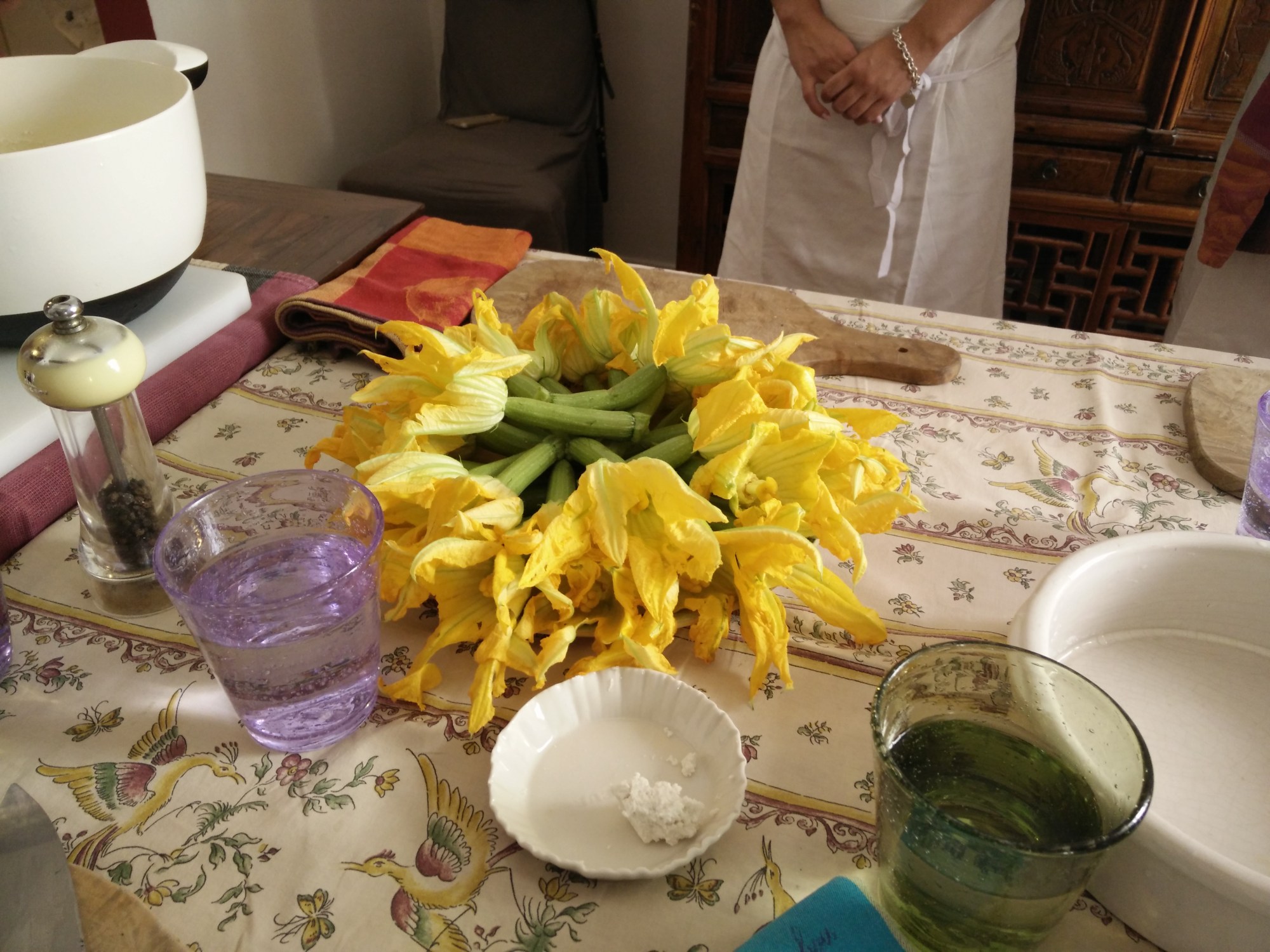 By far the highlights were the food and wine, though. We sampled local wine while we prepared/cooked a 5 course meal. We started with an artichoke salad (who knew you could eat artichoke raw?), ricotta-stuffed squash blossoms with sauteed asparagus, arugula, and mint pesto, stewed fish (tastes better than it sounds) with vegetables, a sampling of four local cheeses, and a cherry clafouti (similar to a baked custard or bread pudding). By mid-afternoon when the lesson ended, we were sated and slightly toasted (well, maybe not Charles).