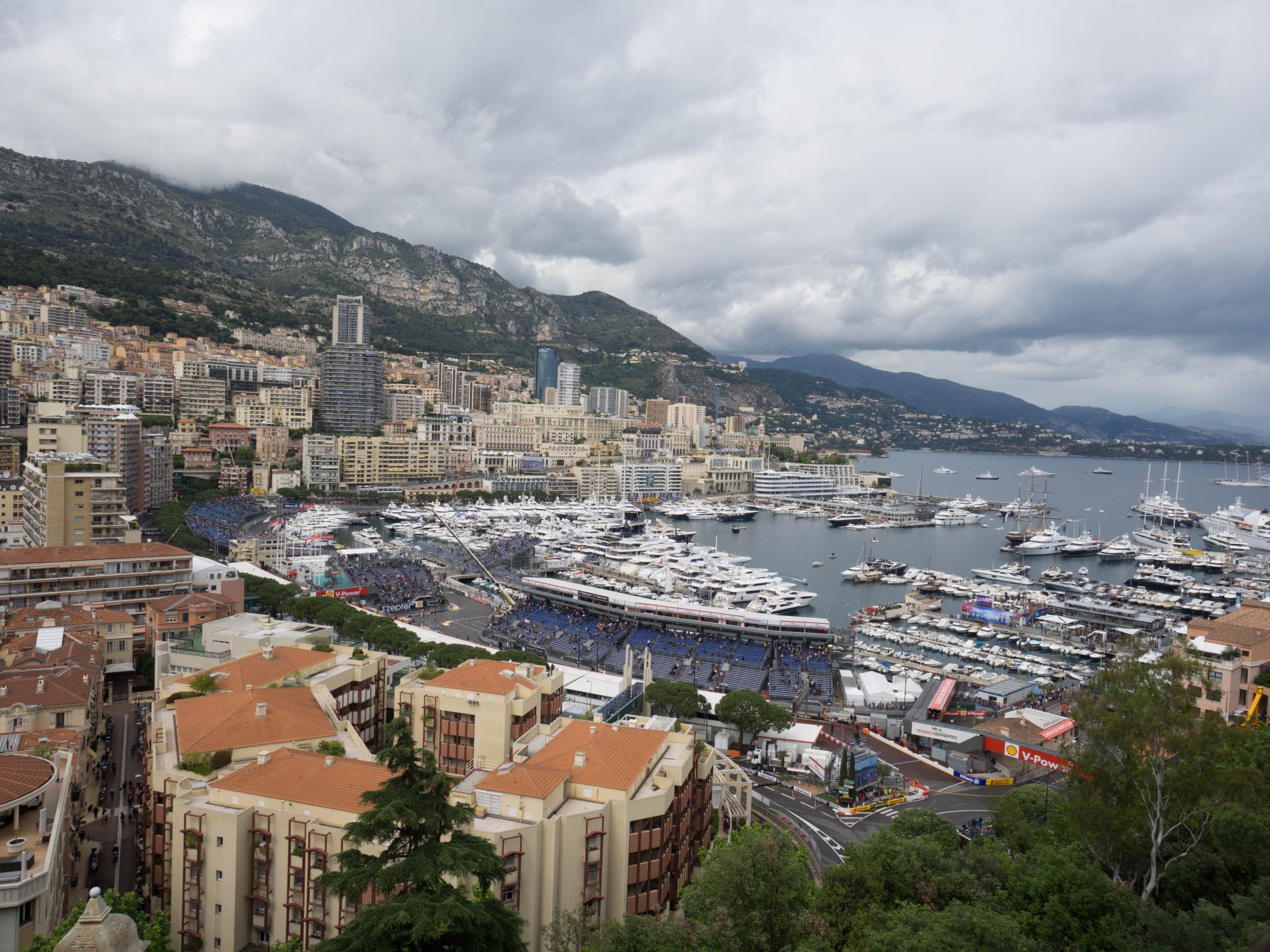 After this tour we came back out and the rain had mostly stopped and the cars were again running so I went over by the railing where you can see all of the harbor area including the second half of the swimming pool chicane and Rascasse so I got out my big lens again and shot some pictures of the cars from up high. Once practice was finished I took several wide shots of the marina and track area and then we headed back down the hill to the train station to go back to the apartment to drop off my heavy camera bag and rest a bit.
