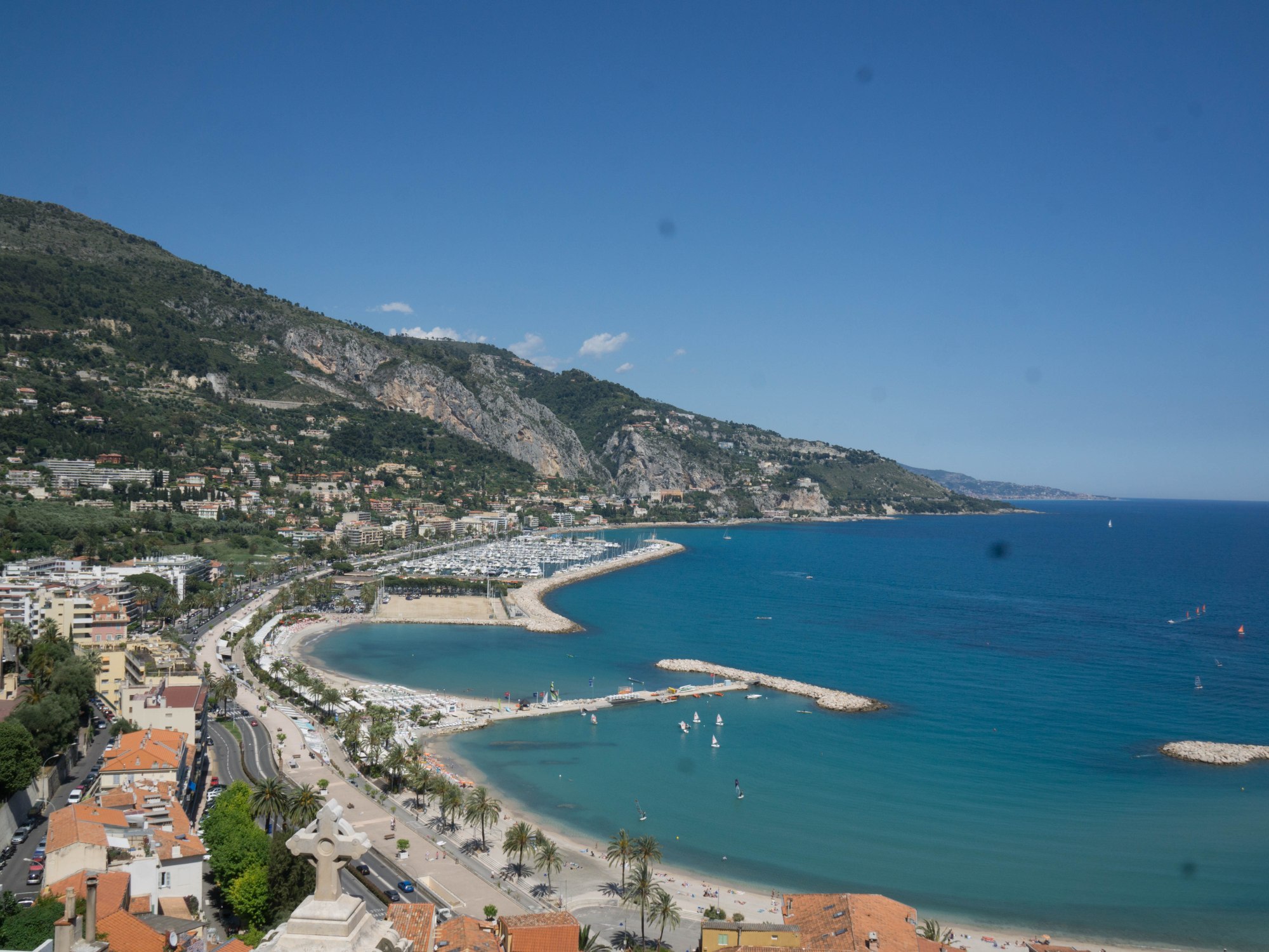 We decided before going to the beach to head up to see the cathedral in the old town across the river that splits the town. This would begin a day of climbing into old town areas to see the sights and the views. After following a winding alley up the hill we found the cathedral and looked through it. I am not certain of the history (no english signs) but it was clearly a VERY old base church with renovations and a “newer” church built on top of the older church. They had a few places where you could look into the old crypt and baptistry which was very interesting. The newer part of the church was very nice as well but the highlight for me was the older part. We continued over to an area where you could overlook the new town and the beach and took a few pictures then went up a short dead end path that had good views the other direction up the coast back into France. After getting a few pictures we headed back down a different path as we had seen a bridge from above that led more directly to the beach. After settling on the beach we watched the waves and ate our “brunch” of berries and cheese then waded into the FREEZING water for a bit. After laying in the sun for a while and feeling nicely toasty we packed back up and went a different route back to the train station. After a few twists and turns I convinced Becky we had to give Italian gelato a try as well so we stopped to eat a bowl each of gelato. We then caught the train to Menton.