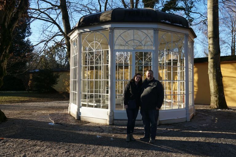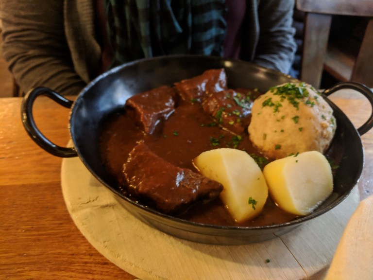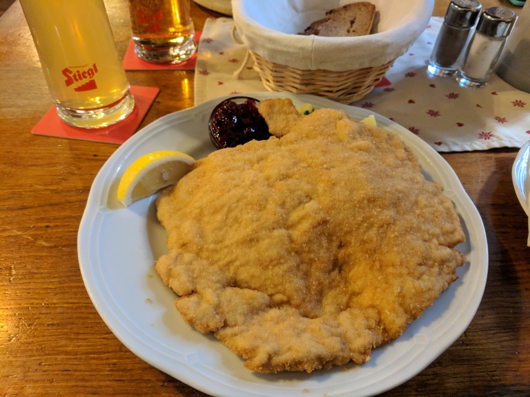 I had a schnitzel the size of a plate and potatoes and a grapefruit radler and Becky had an amazing looking bowl of goulash with potatoes and a dumpling and a beer. We went back through the Christmas market which was just starting to open when we went through on our walking tour and got some dessert and some gluhwein and rested before our next stop. The afternoon plan was a Sound of Music tour we had prebooked online. We found the tour office and paid then grabbed a few drinks and waited for the rest of the tourists to arrive. We were with a newly married couple and a mom and daughter so 6 of us total in a nice van for the 4 hour tour partially in town and some out in the lake district. If you didn’t know the von Trapp family really lived in Salzburg and some of the movie was filmed there as well so we visited the houses they used for the facades, the lake that they fell out of the boat, the gazebo and the church they got married in.
