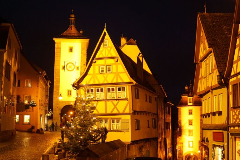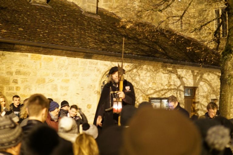 We decided to eat dinner early and to try and be European and enjoy a nice long meal. We we’re the first in the restaurant and settled in but eventually as happens in many German restaurants another couple was seated with us as we were wrapping up our meals. They were very nice and he was stationed in Germany with the Army and they were from Louisiana. We talked for a while and realized we we’re planning on doing the same thing after dinner. We excused ourselves and paid before heading back to the market square for the night watchman’s tour. This is a long standing tour by a guy named George who take tours nightly around Rothenburg and gives a fun and funny historical look into what the town was like in the 14-1700s in particular for a lonely night watchman.