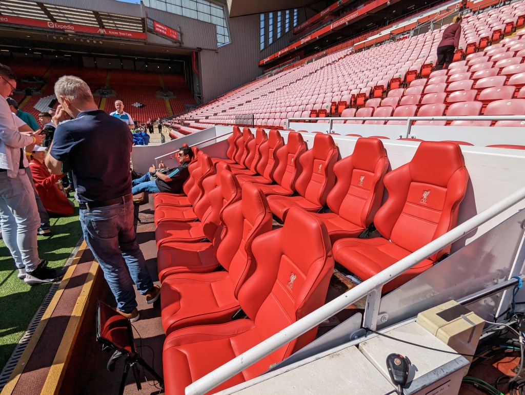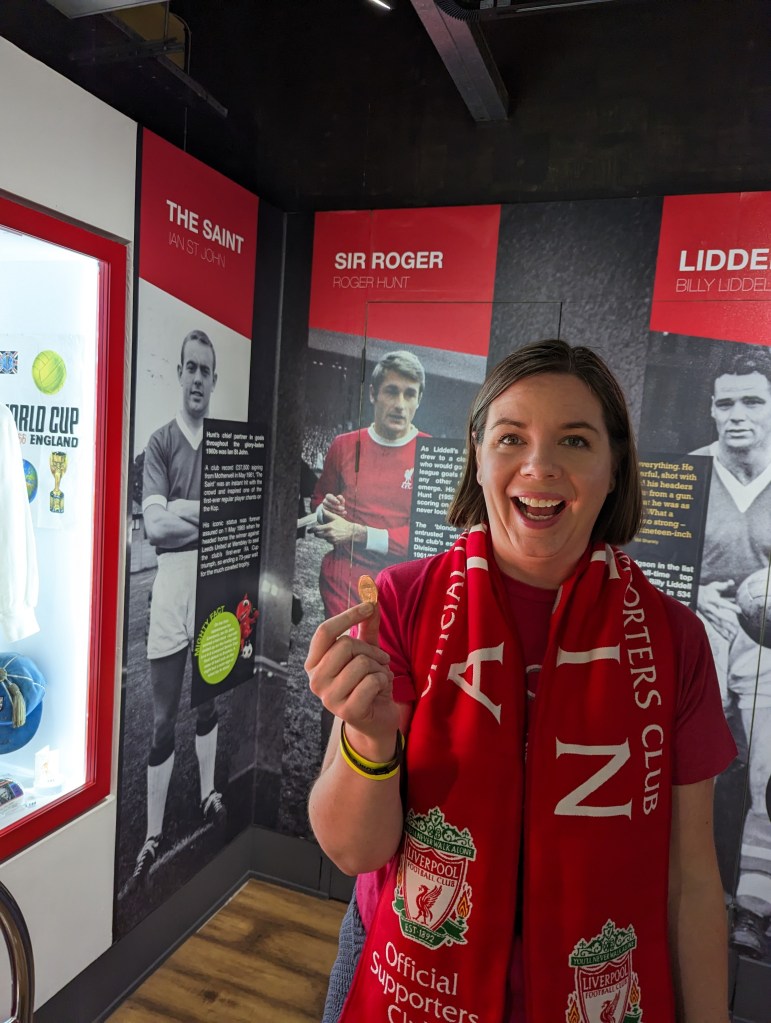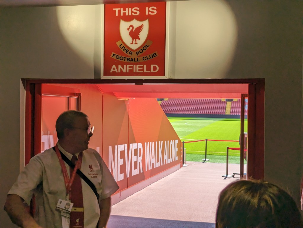 We got up and got ready and had breakfast at a little cafe next door to the hotel then proceeded to catch the bus over to Anfield. First thing on the agenda was a stadium tour we had booked so we got over there and wandered around a bit until time for our tour. The tour was fun. We got to see the players entrance to the building and the walkway onto the pitch. They then took us out pitch side and we got to walk along the sidelines and see the dugouts and the whole stadium from field level. They then took us over to the Kop stands (the main supporters stand).