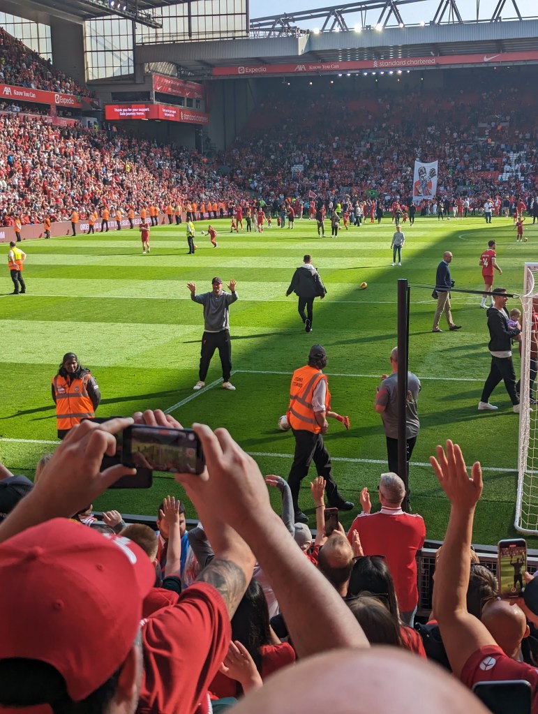 Definitely learned several new words and gestures which I assume were just polite British ways of saying hello. There was a bit of a moment after the match where a Liverpool fan ducked under the barrier and got into it with a couple of Villa supporters who ended up having to be dragged out by multiple security guards. One really cool thing is it was the final home game for several Liverpool players the most popular was Robert Firmino and he came in to much fanfare in the second half and secured the draw with a goal in the 89th minute! After the match they gave the departing players some gifts and all the players paraded around the whole stadium while kids played soccer on the pitch.