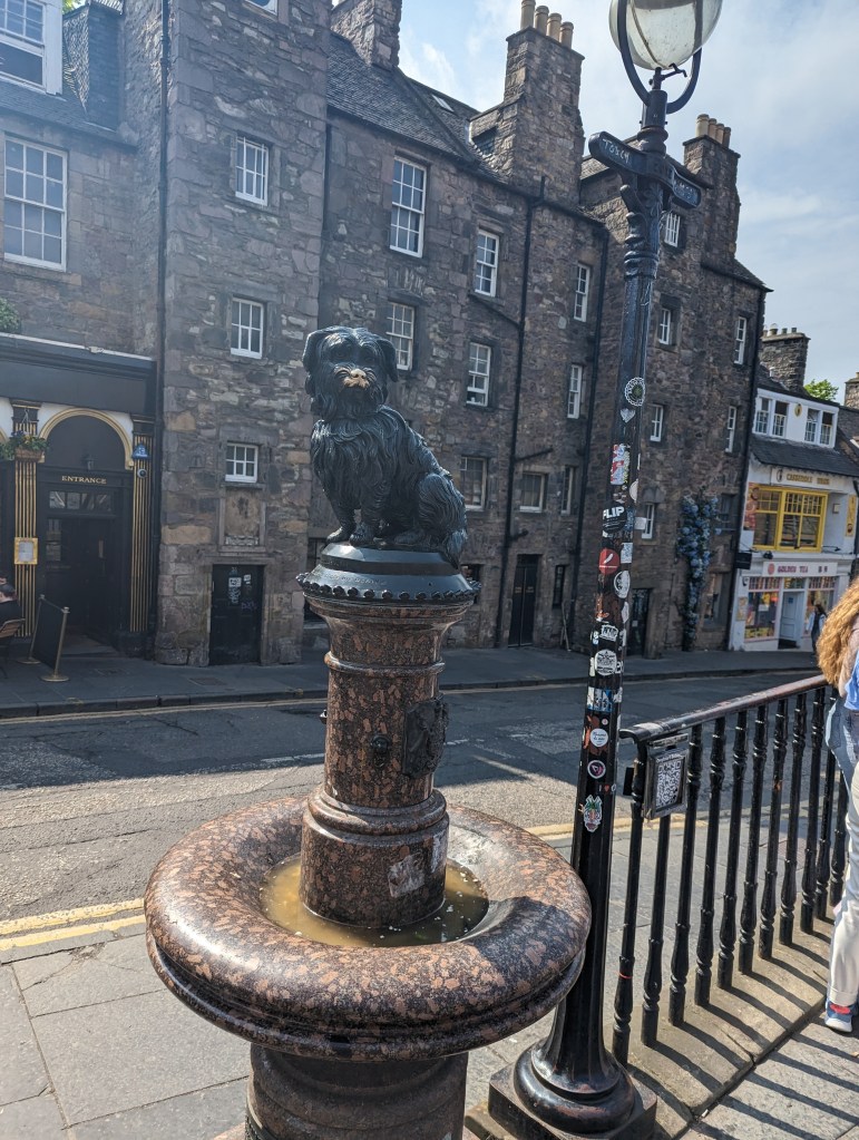 I told them they need to come try American BBQ pork as well but that this stood up to it. After lunch we headed back to the castle by bus and passed by Grey friars bobby statue and pub. This is the statue of a little Scotty dog who would come to guard the grave of his owner after he died.