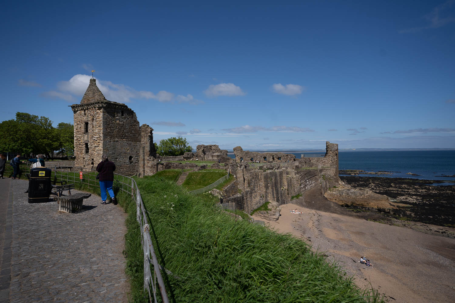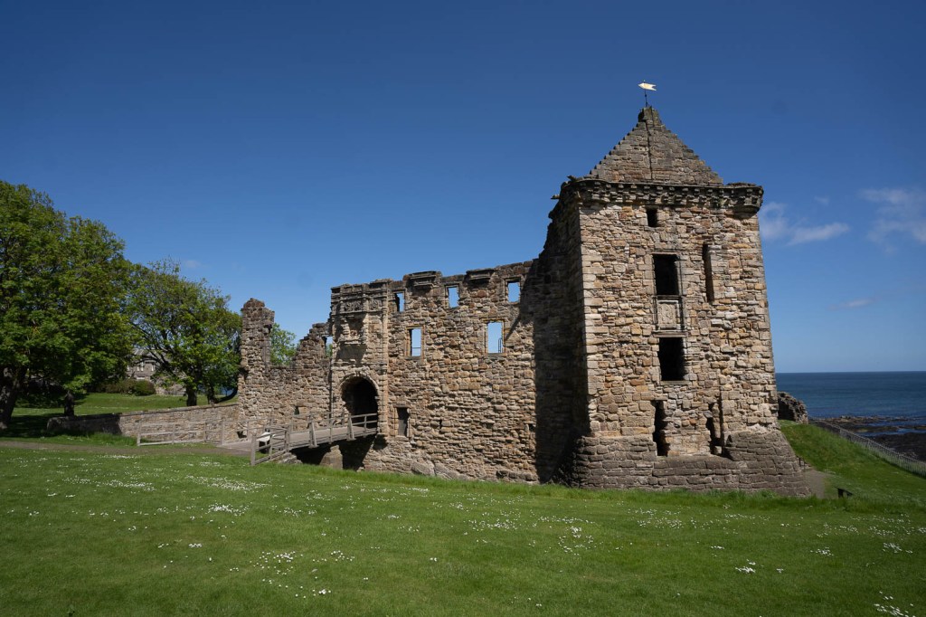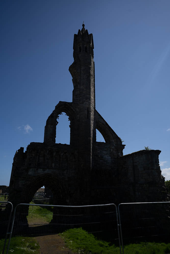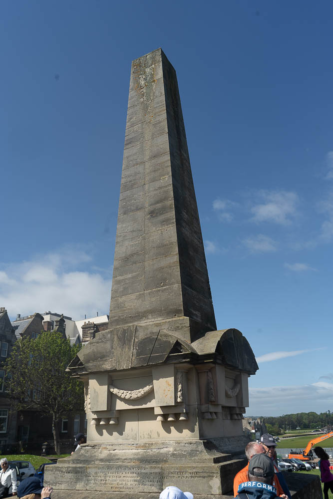 I headed to the hotel to pickup Becky and our luggage and we got on the road out of Edinburgh and on to St. Andrews. We only took a couple of wrong turns out of town and soon were on the slightly higher speed highway across the Forth of Forth and heading east. A bit out of town you get back to 2 lane country roads and with the different driving perspective I had a little trouble staying in the lane properly but eventually got the hang of it and we arrived in St. Andrews. We were both looking for a restroom break and asked at a coffee shop near where we parked and they pointed us to a gem of a bookstore called Topping and Company and if you know Becky and I we love a good bookshop. They had Becky from the moment they offered her coffee in a china cup to drink while browsing. We got a couple of small books then it was time to meet our walking tour. Our tour started by the Martyr’s Monument near the golf course and the beach. The Martyr’s were 4 reformation timeframe protestants who were burned at the stake.
