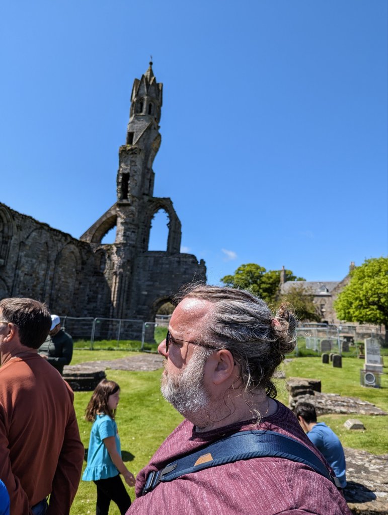 Today Chuck left bright and early to go pick up our rental car for us to head into the Scottish Highlands. We had a walking tour booked at 11 in St Andrews, so were somewhat anxious about the possibility of delay with the rental car, but all went pretty smoothly and Chuck swung back to the hotel to pick up me and our luggage with plenty of time for us to get to St Andrews, park, and do a little exploring before the tour. Being on the “wrong side” of the road took quite a bit of adjustment for both of us. As soon as I got into the car on what felt like should have been the driver side, I warned Chuck that if I fell asleep while he was driving, I absolutely was going to wake up screaming, finding myself in what felt like should have been the driver’s seat on the wrong side of the road. Roads were narrow and curvy for quite a bit of the route and Edinburgh is fairly bike-friendly, which meant bikes everywhere for the first part of the trip.