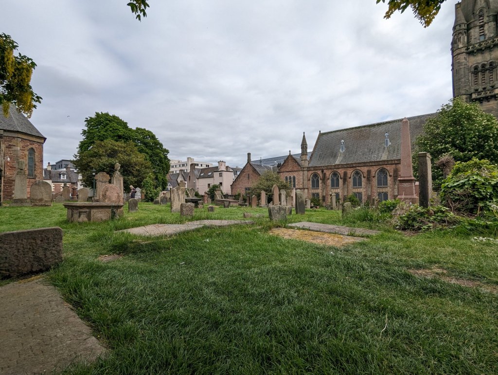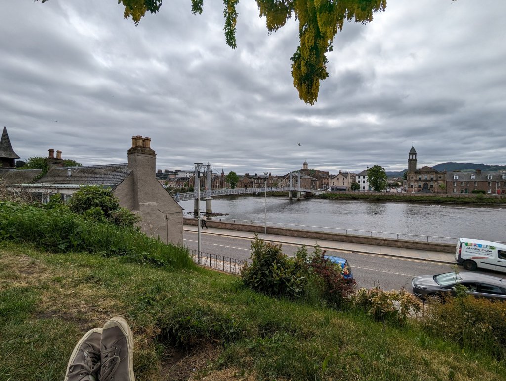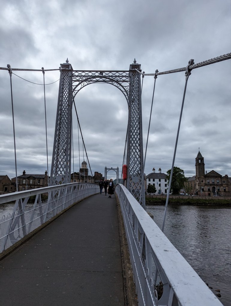 We have a teeny tiny hotel room and I was afraid if I hung around, I’d keep waking him up, so I headed out to do some more exploring around Inverness. I grabbed a “fish stick sandwich” and a local beer from the Victorian Market we visited yesterday, checked out a really cool used book store that reminded me of Powell’s in Portland, sat and read in a graveyard overlooking the river, walked across an unnervingly bouncy suspension bridge, people-watched for a while at a sidewalk cafe with a hot cup of tea, and checked out the Inverness Museum and Gallery.
