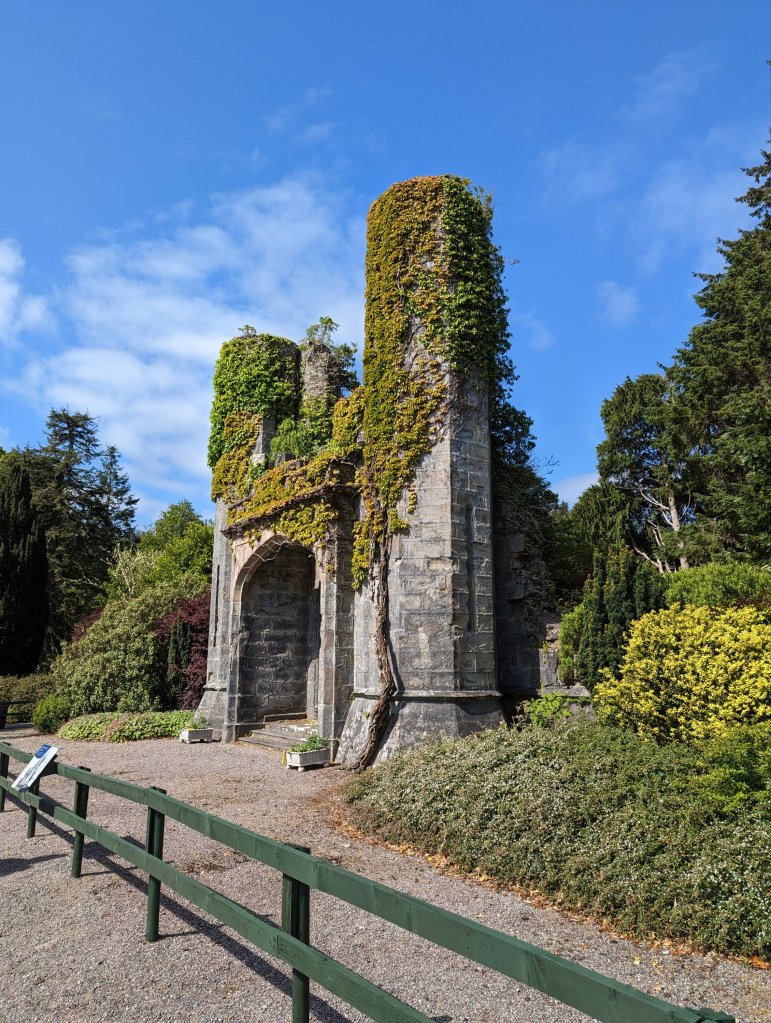 We enjoyed our time on the Isle of Skye, but today it was time to move on. Chuck pre-booked our fare on the ferry off of Skye at 12:30, so we had a little time to explore the ruins of yet another castle, Armadale. This one was the sequel to Duntulm Castle, the ruins we visited yesterday and is where the MacDonald clan moved after they left Duntulm (and the home of Flora MacDonald whose monument we visited yesterday). It’s a rather interesting story as to how it came to ruins. It served as a residence for the MacDonalds right up until 1930 and then for the next 20 years it was mostly just used occasionally for big parties. However, once the housekeeper retired in the 50’s, it fell into disrepair. By the time anyone was ready to do anything with it, it was too foregone to salvage, so in the 80’s they got permission to demolish parts of it and make it a “sculptured landscape”. Unlike some of the other ruins we visited, we couldn’t actually climb through them, but they were interesting to look at nonetheless. They reminded me a lot of how I picture Thornfield Hall in Jane Eyre.