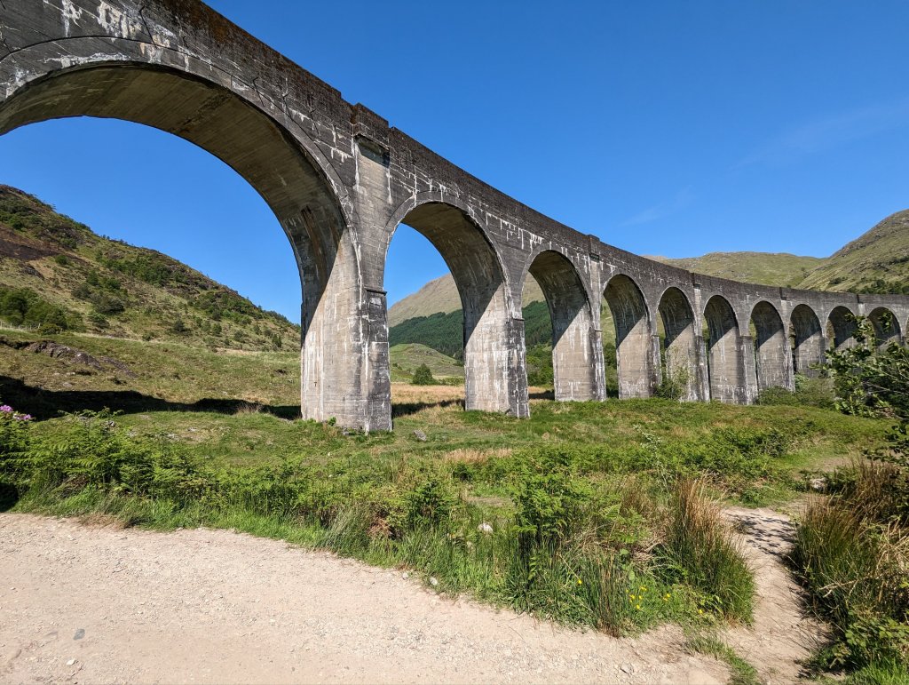By this time it was well past lunch, but we decided to hold out and eat at the visitor center cafe at our next stop, which was the Glenfinnan Viaduct and a Bonnie Prince Charlie monument. The car park was almost completely full when we got there, with tons of people in Harry Potter t-shirts meandering around because the viaduct is featured in the second film of the Harry Potter series when Harry and Ron fly over it in the charmed flying car (I can’t remember whether it’s specifically mentioned in the book or not). Not surprisingly (and perhaps a little sadly), the monument was a little less busy than the viaduct trail. It commemorates the spot where the Bonnie Prince arrived back in Scotland after his exile and appealed to the clans to help him reclaim the throne (and where he later retreated after the battle of Culloden). It was nice to check that off of our Jacobite history bingo card and the view of the loch behind it was very picturesque.