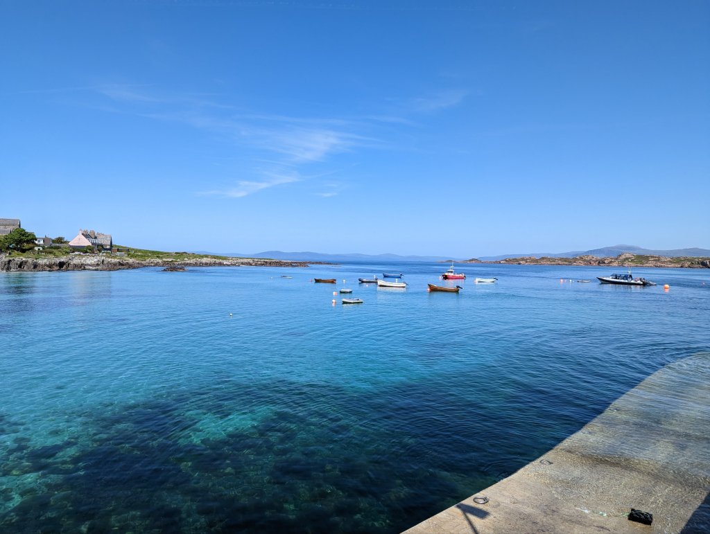 Today we toured the islands of Mull and Iona, part of the inner Hebrides off the coast of Oban. Our tour embarked mid-morning by ferry from the Oban terminal. The first ferry ride was about 45 minutes. The sun was out, the sky was clear, and we had a beautiful view. At one point we even spotted some dolphins and jellyfish. Once on Mull, we boarded a tour bus and rode for an hour and 20 minutes to the other end of the island. There were some pretty views from the bus, as well as some chatter from the bus driver over the PA system, pointing out sites of interest along the drive in a comforting Scottish brogue. After the bus we got on yet another ferry, this time for a 10 minute ride over to the island of Iona.