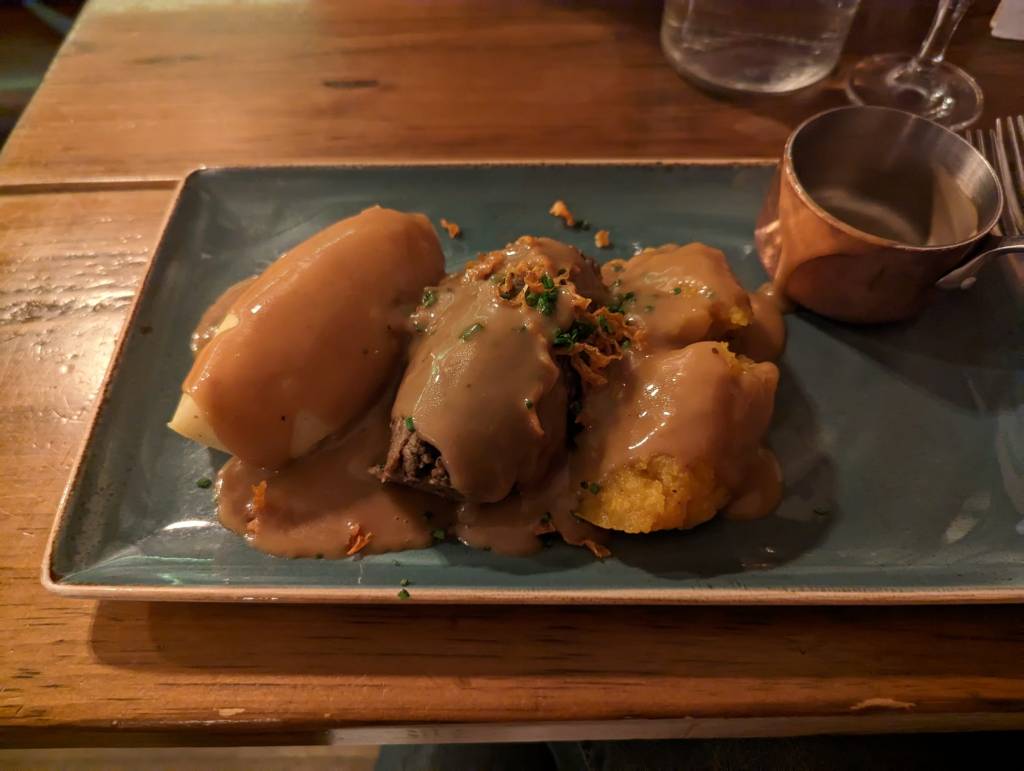 After the castle we were headed to Glasgow to drop off our luggage but I made a quick detour to see the Falkirk Wheel which is for lack of a better term a rotating boat elevator to bypass a long series of locks to get from the top level to the bottom. We didn’t have time to stop but it was cool to see an engineering marvel in person. Leaving there we ran into what seems like it should be a more common thing given lots of tourist busses and narrow streets and low bridges. We came through a single lane low railroad bridge to see a bus in the middle of the road facing us. Normally no biggie just work around each other and move on. Nope this bus driver had apparently not realized the bus couldn’t go through this tunnel bridge and was now attempting to back out of this street and turn around.. but instead of using the convenient dead end driveway at the end they continued very slowly back around the bend and finally to a side road. Here again they could have decided to let the queue of cars that had built clear and possibly cleared their head but they decided to power through. They proceeded through about a 5 point turn to pull back into traffic and then forced a bunch of cars to move over out of their way (again they could have let this all clear up first) before proceeding until they were side by side with a tractor where they had a little chat just the 2 of them while we all waited and watched. They finally turned away from our path. Hopefully for all the tourist’s sake they made it where they were going! After that fun we headed to Glasgow Central to drop off our luggage. This place was not easy to find so i am hoping that despite appearances it also makes it difficult to steal from. We finally after a bit of searching found the convenience store that also was a luggage storage location and got our stuff settled there.. this let us keep the luggage near the train station where we will leave tonight but to return the rental car with less encumbrance. We drove out to the airport and dropped off the rental and caught a cab back to the train station. Becky had her heart set on one last Haggis, Neeps and Tatties meal for lunch so she found a place nearby.