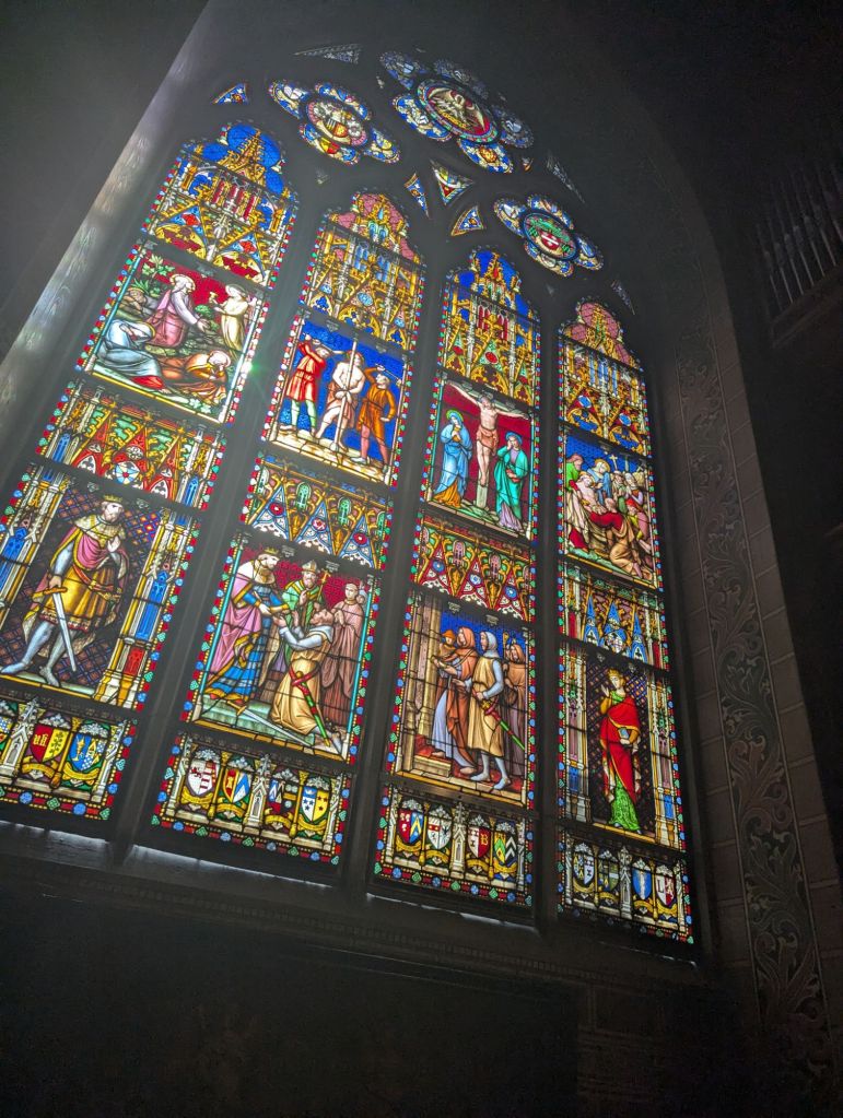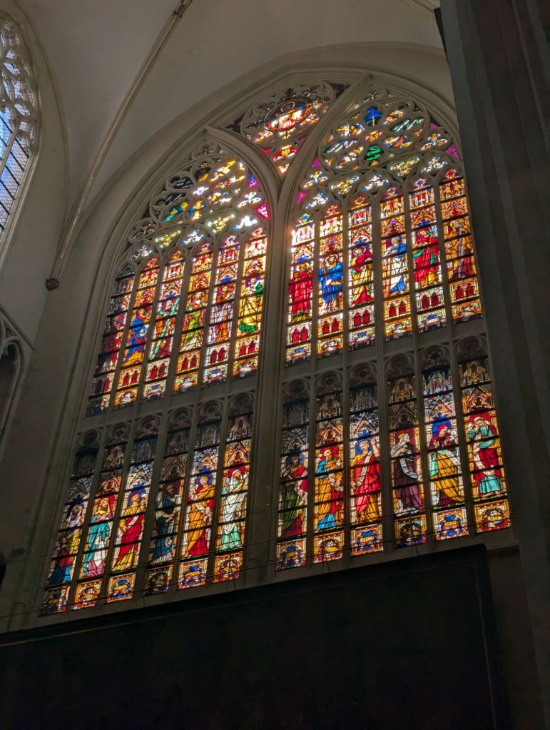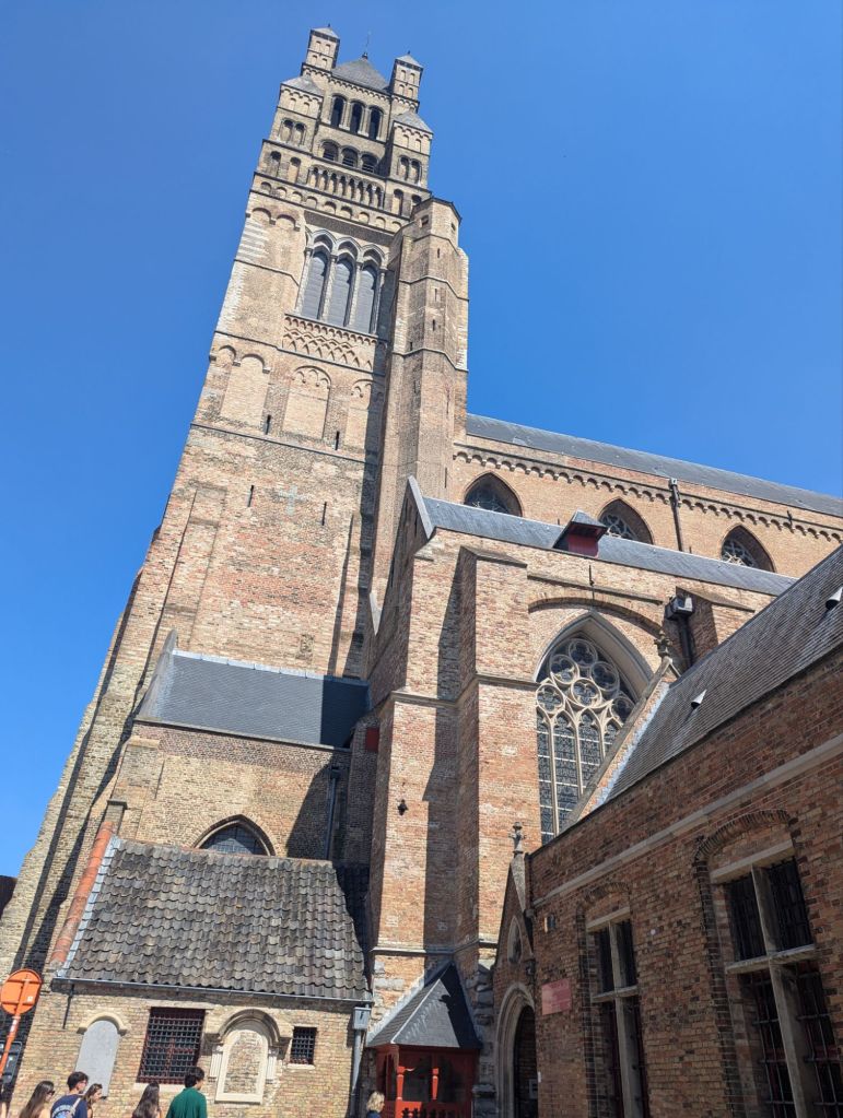 Yesterday was our longest day yet for this trip and our watches tell us the most walking in a day so far, as well. Since Lille is in the far northeastern corner of France, we found ourselves just an hour and a half away from Bruges, Belgium by train. In our preparation for the Normandy portion of this visit, we watched a lot of movies and series about WWII activity in France and the surrounding area, including the movie Monuments Men which is based on a book and the true story of a group of men who traveled around Europe during WWII attempting to locate and protect art while the Nazis were attempting to appropriate as much of it as possible for Hitler’s museum. Part of the story took place in Bruges with Michaelangelo’s Madonna and Child sculpture.