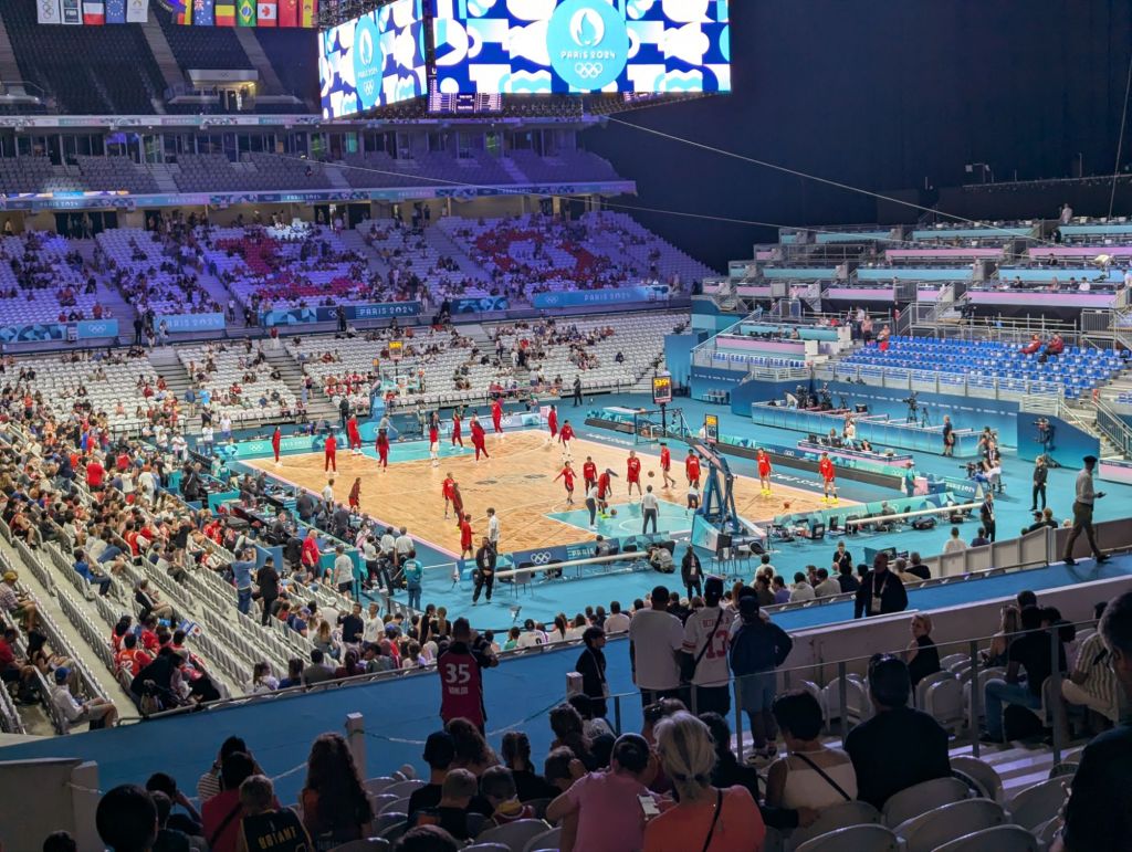 Becky was able to recover from her poor life choices on the train back to Lille, where we then caught a metro to the area with the basketball arena. We got there reasonably early, but found a lighter crowd than we had encountered the night before, giving us more flexibility to check out a nearby fan zone and relax in the shade for a bit.