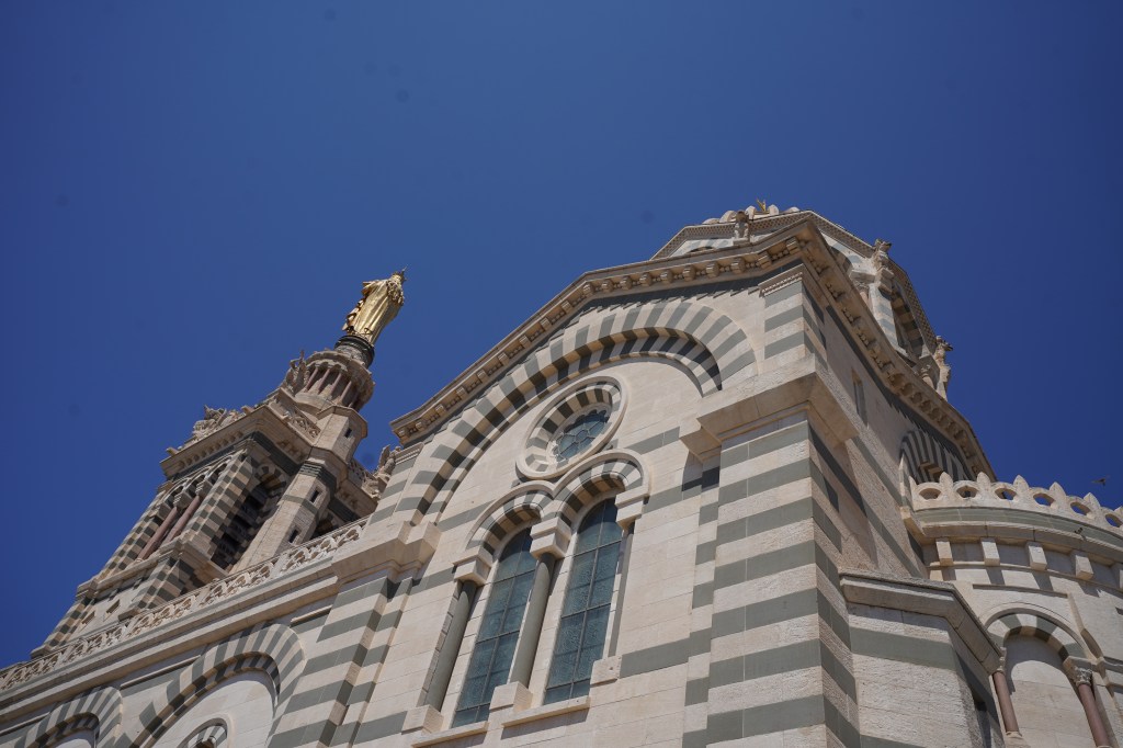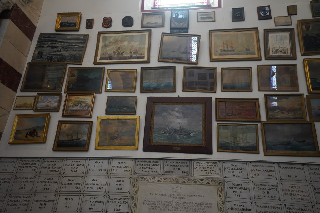 It was already past 1 pm, so we stopped at a fast food type restaurant for a salad and sandwich and then caught the bus to the top of the mountain to check out Marseille’s top rated tourist attraction: Basilique Notre Dame de la Garde. In our bracket for most beautiful cathedrals on this trip, this one would perform well. We’re beginning to lose track of cathedrals we’ve seen, so we don’t know exactly how it fared relative to the others but it was very ornate. We should have formalized the bracket prior to the trip so it would be easier to keep notes. Possibly the biggest point in its favor is that it sits on top of a large hill (remember when we said everything cool in France is on top of a mountain?) with a great panoramic view of Marseille and the sea.