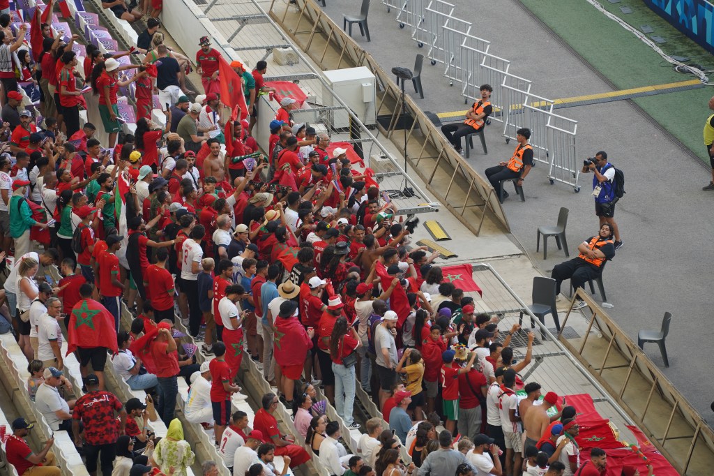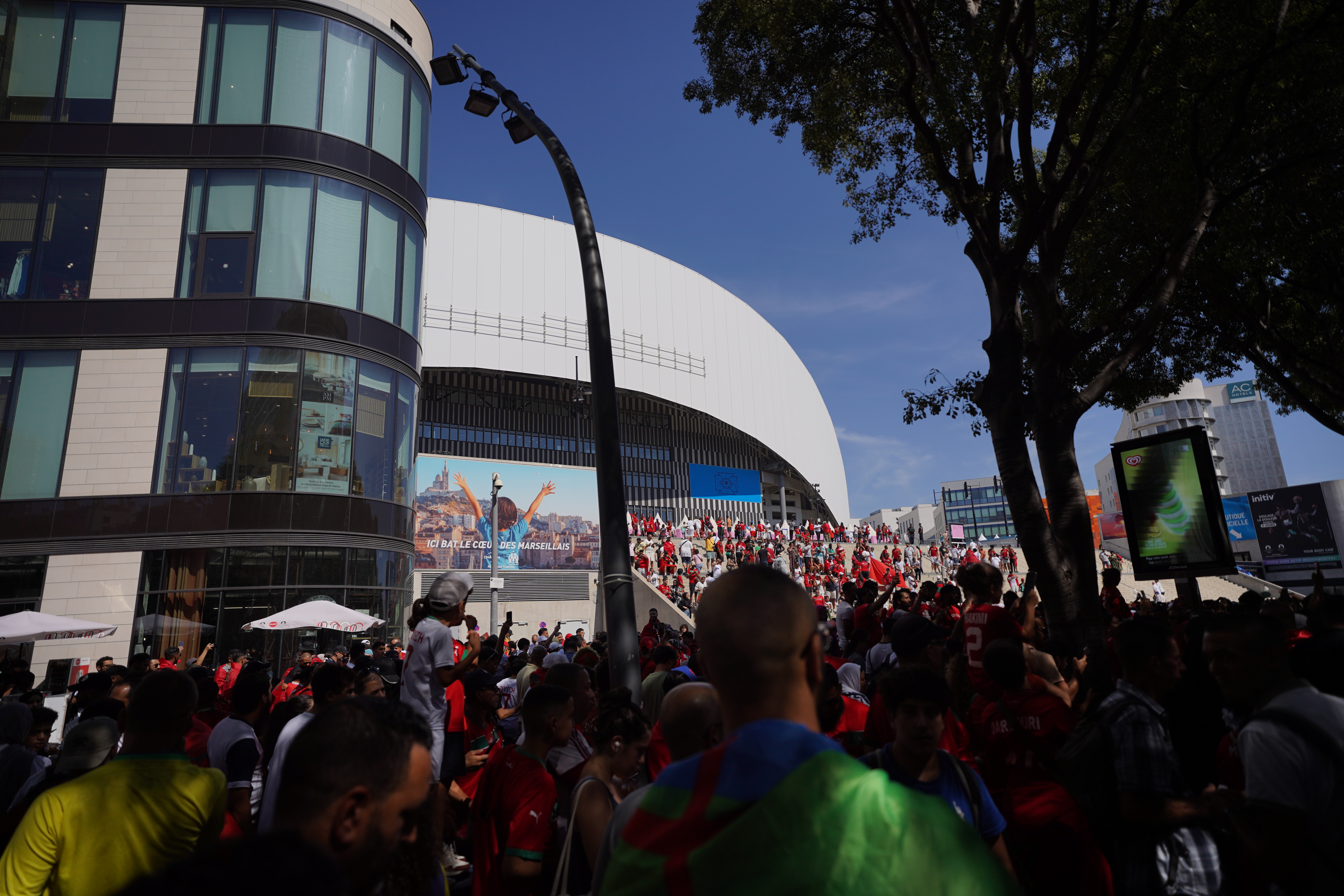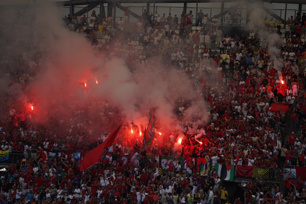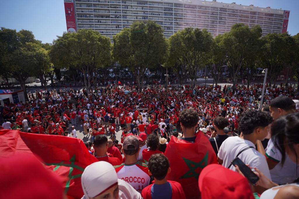 Big crowds of Morocco fans filled the area outside the stadium, chanting and setting off flares and fireworks. There were a few people in Spanish colors, but the vast majority of fans were cheering for Morocco. And we’ve heard some loud fans at matches before but nothing to rival the roar inside the stadium as the Moroccan team took to the pitch for warm ups.