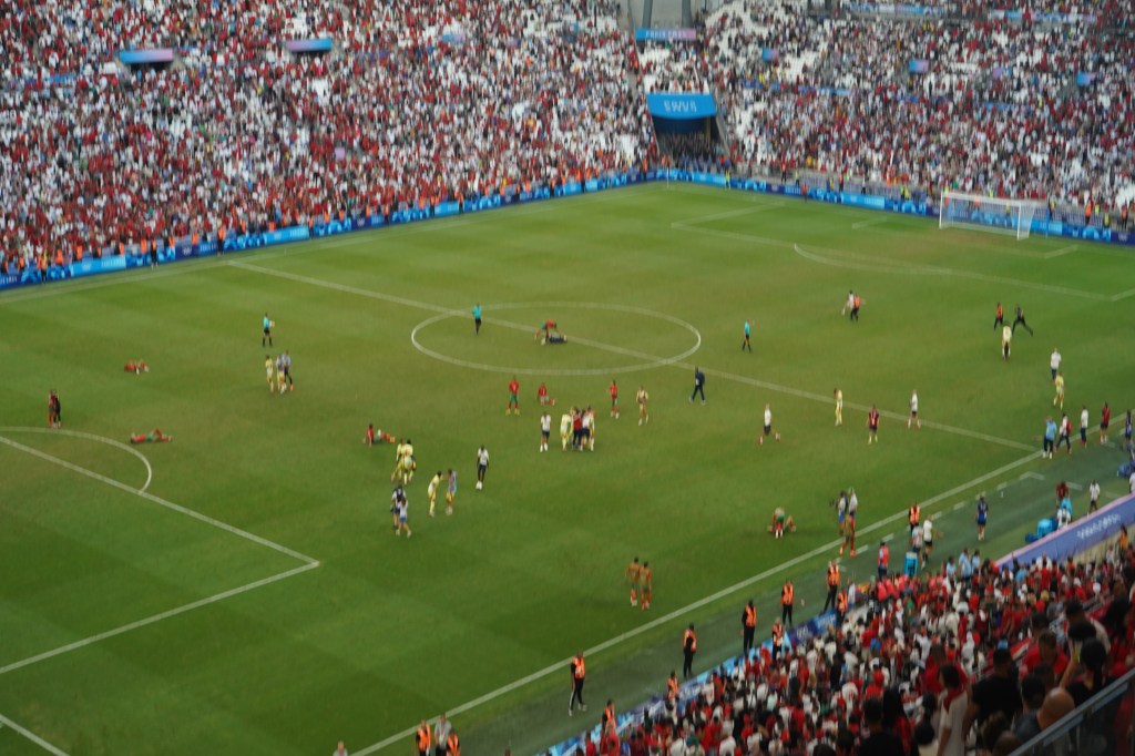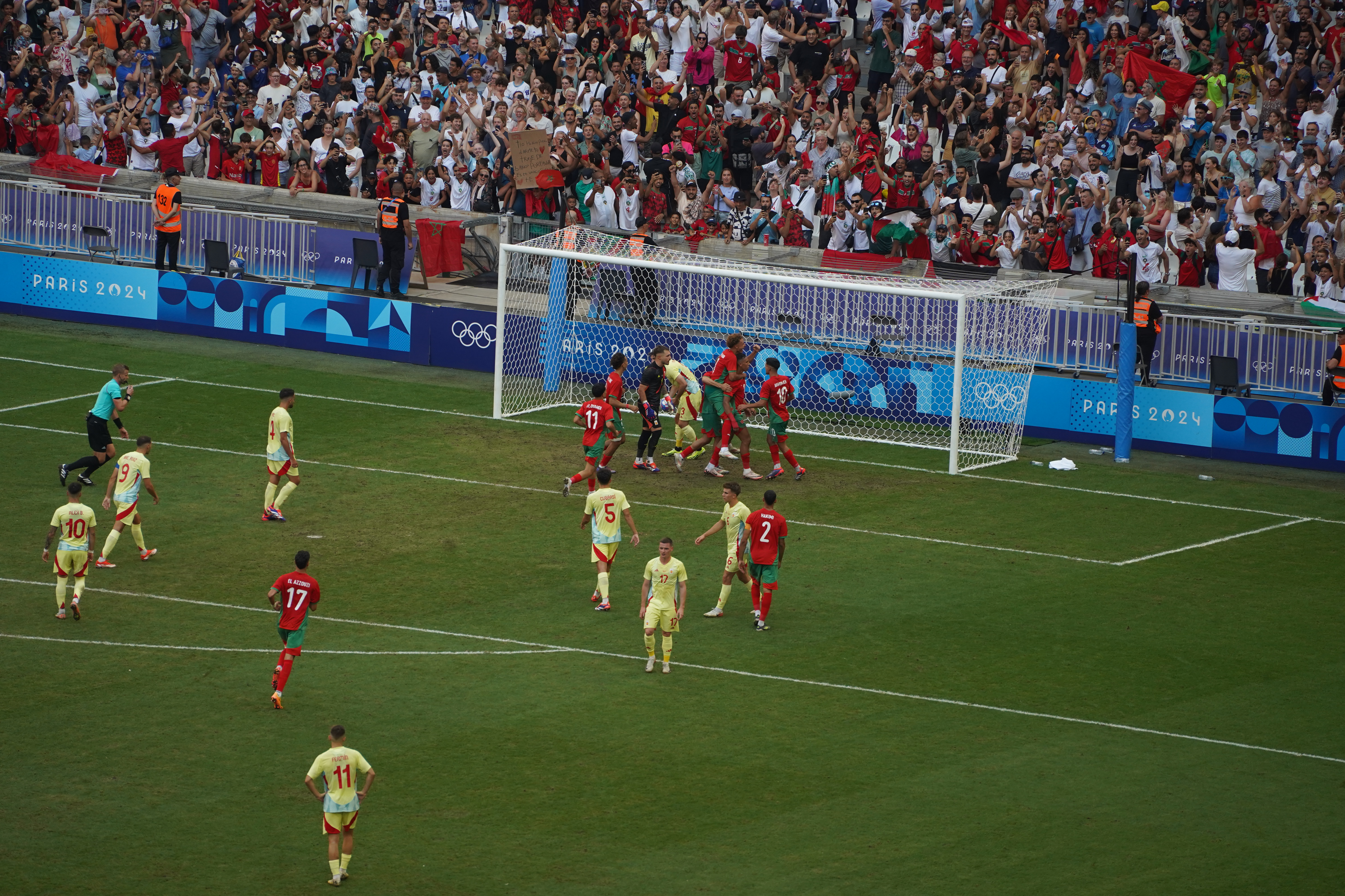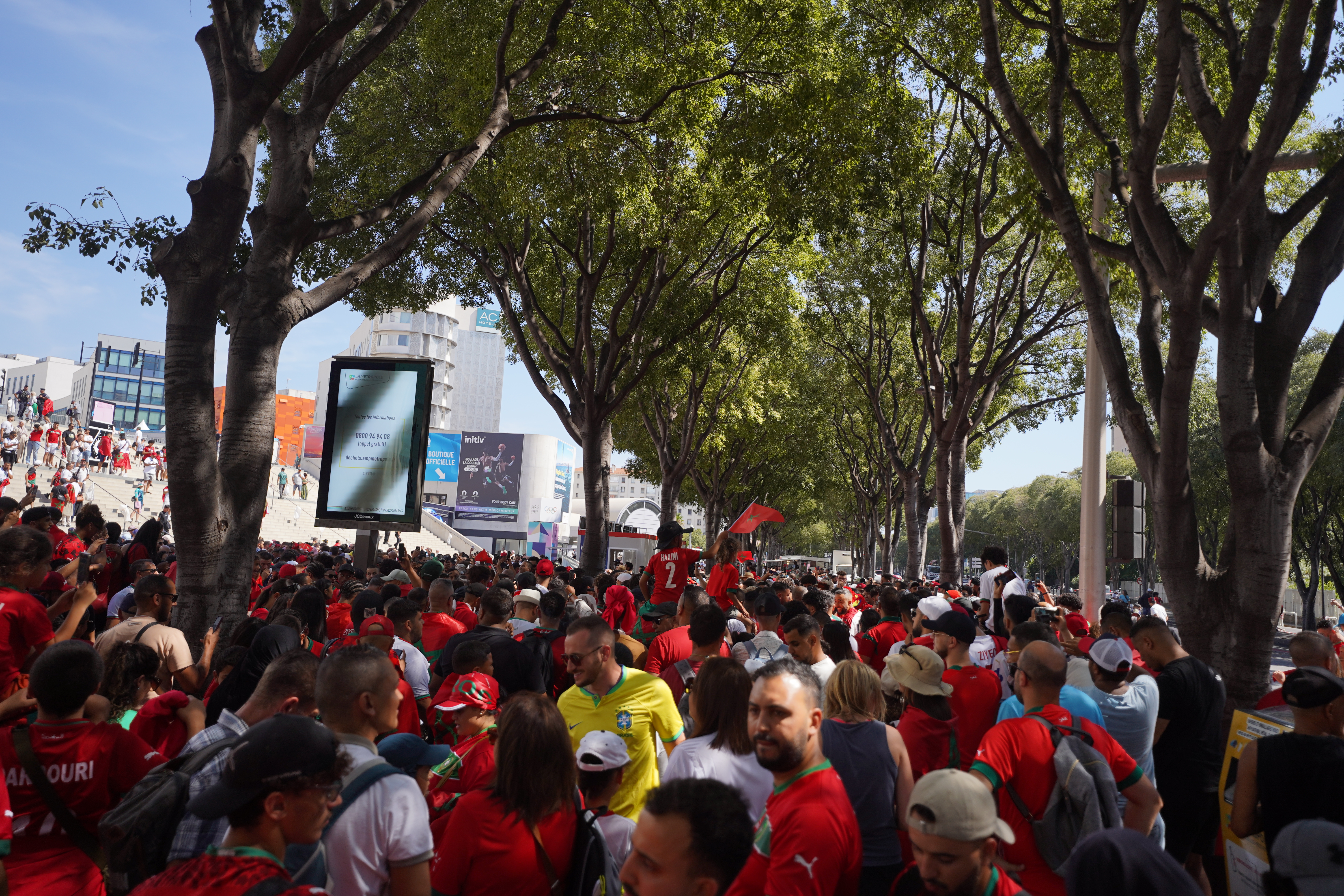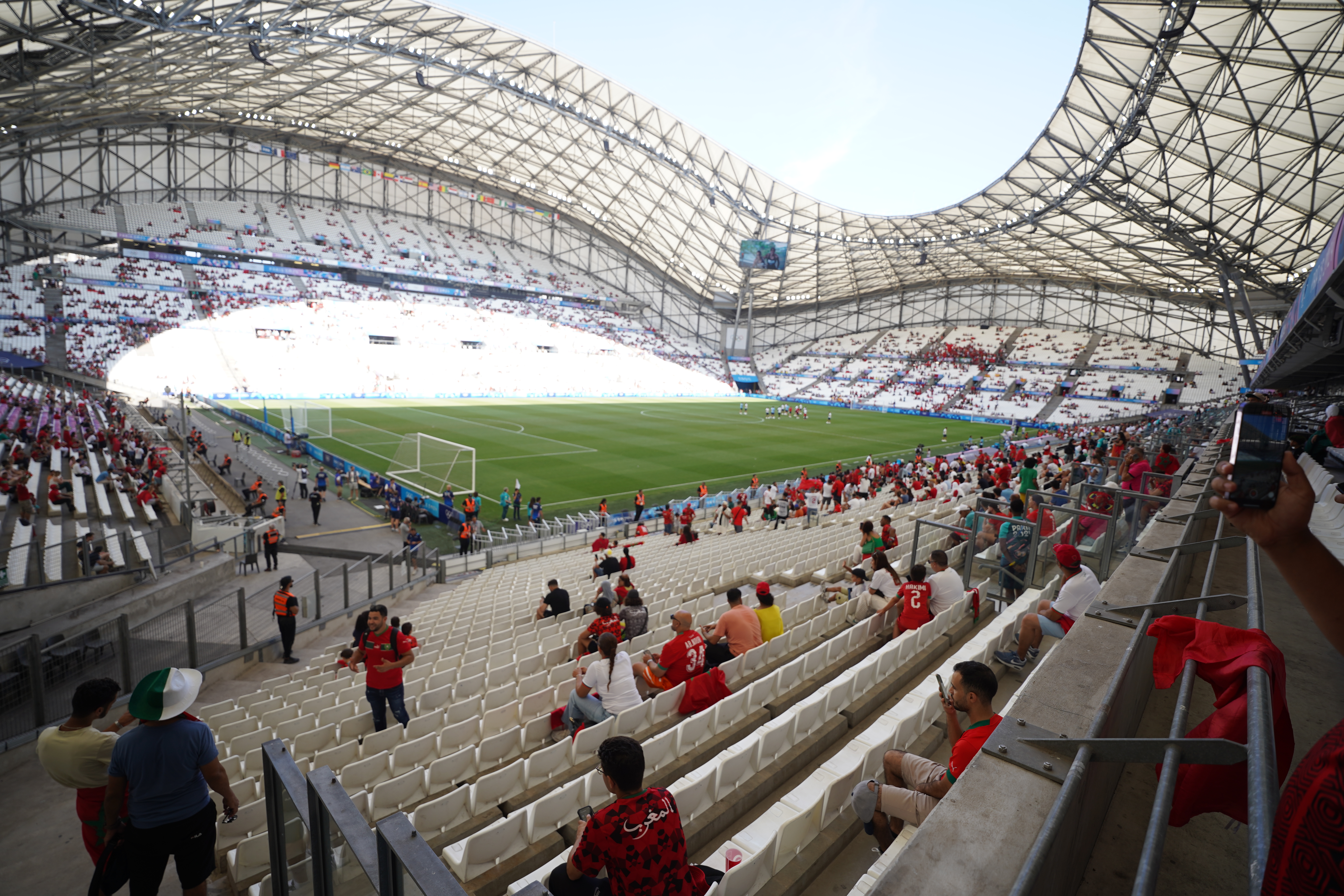 Big crowds of Morocco fans filled the area outside the stadium, chanting and setting off flares and fireworks. There were a few people in Spanish colors, but the vast majority of fans were cheering for Morocco. And we’ve heard some loud fans at matches before but nothing to rival the roar inside the stadium as the Moroccan team took to the pitch for warm ups.
