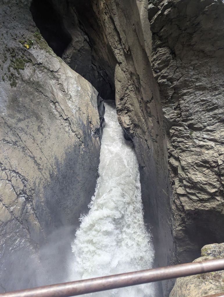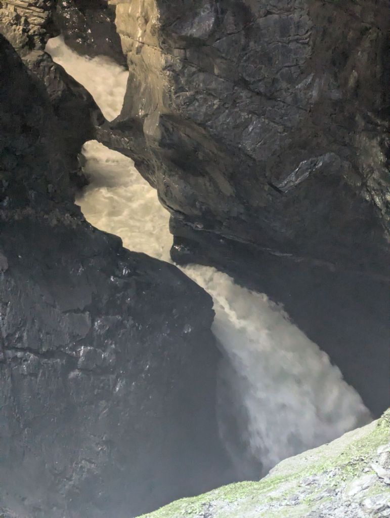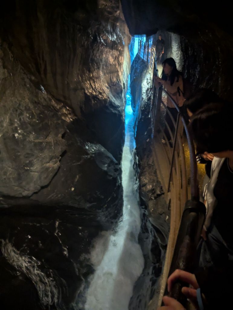 Riding a little further we saw signs for another interesting falls the Trümmelbach falls so we detoured and backtracked along the car road for a bit. Chuck almost fell once and Becky was a little nervous with the traffic but we made it safely and tentatively parked our bikes. We just had to hope for the best of people as we had no locks but it all worked out in the end. We paid the entry fee and headed up to a diagonal elevator into the mountain for this waterfall that is almost entirely inside the mountain. It bores its way through creating huge gashes and pools as it makes its way down from the Jüngfrau glacier melt to the valley. This was an amazing (if a bit wet) experience and we are definitely glad we made the detour.