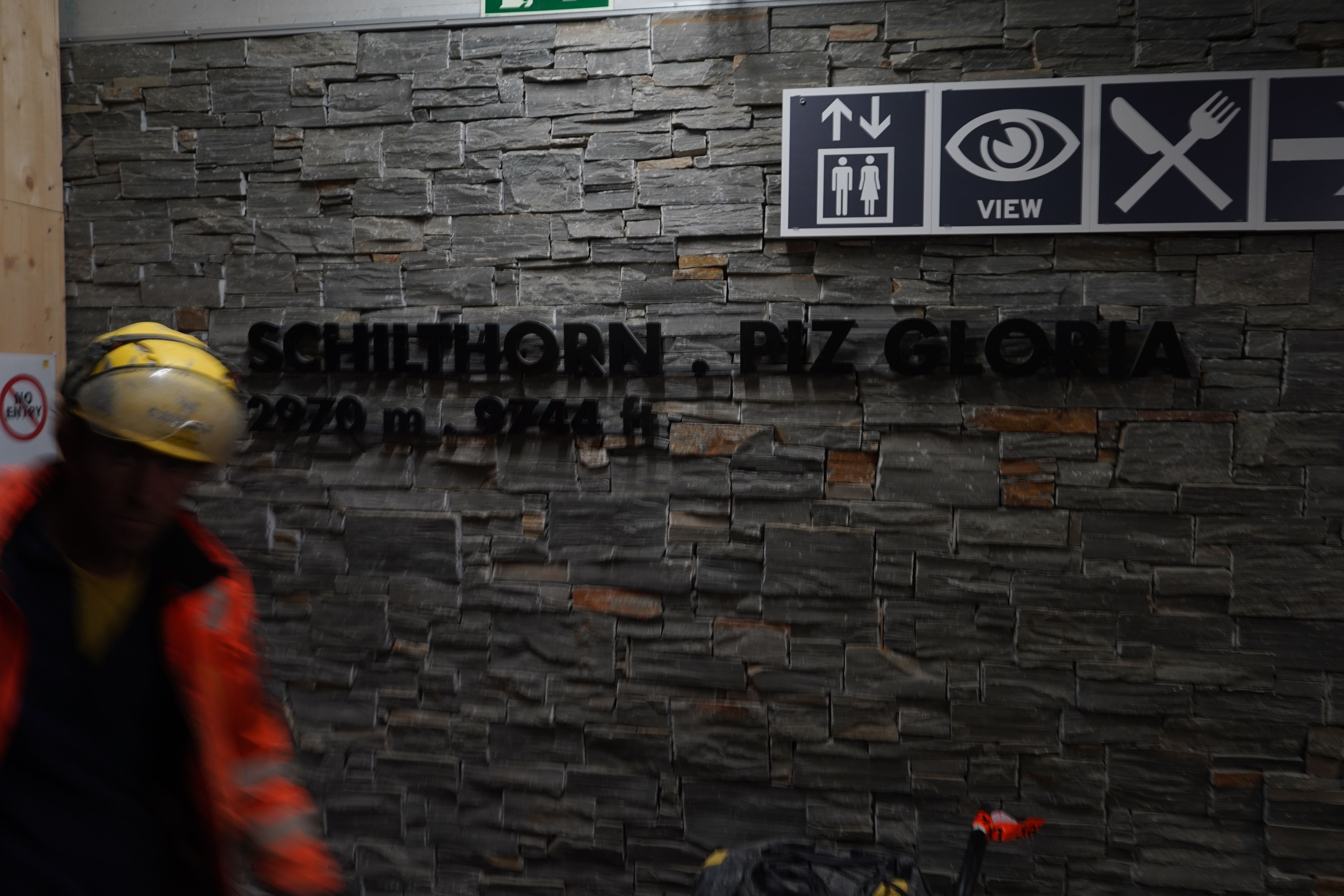 We got to the station just as the car was leaving (at an unscheduled time) so we sat to wait on the next one we expected at its usual time in about 10-15 minutes. Despite the signs to the contrary the next car left about 45 minutes later which we were afraid would put our breakfast reservation in jeopardy. We caught the next 2 cable cars with little issue and arrived at Piz Gloria on top of the Schilthorn a few minutes after our reservation but they seated us right away. The Piz Gloria station was built for the Bond movie “On Her Majesty’s Secret Service” and features a revolving restaurant. We enjoyed a great buffet breakfast with more choices than we could try and just relaxed watching the view slowly change.