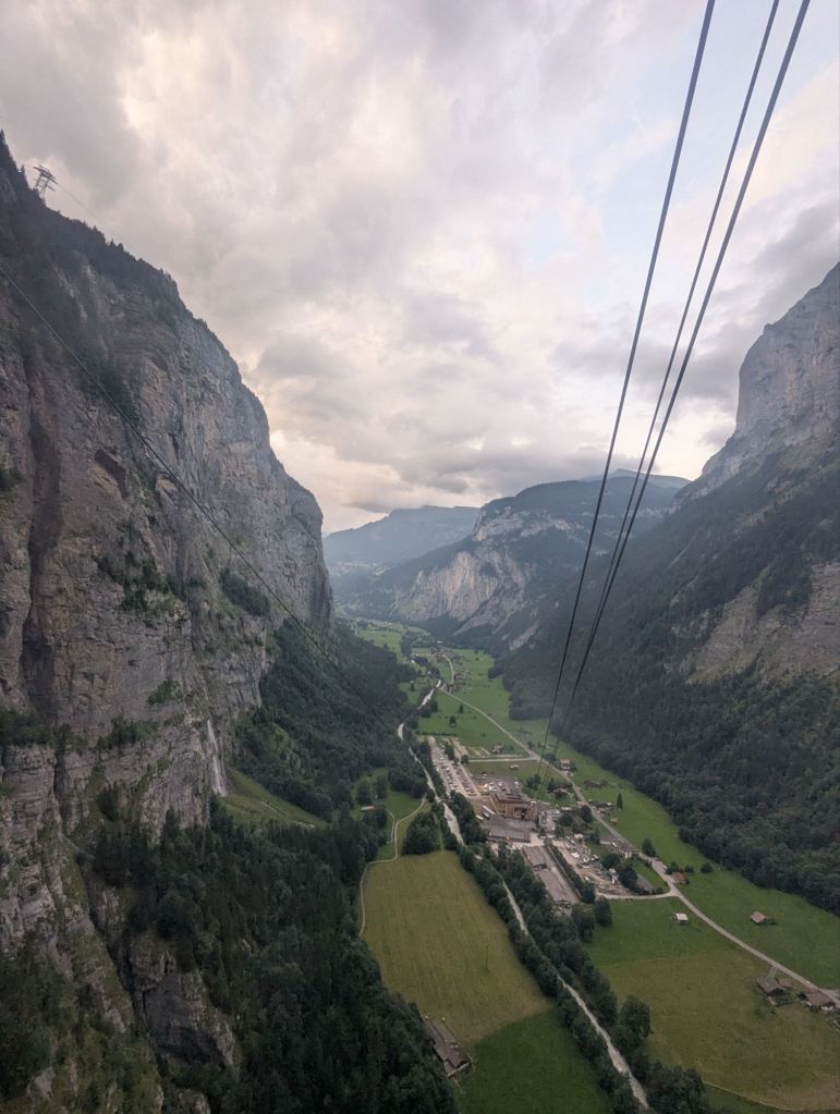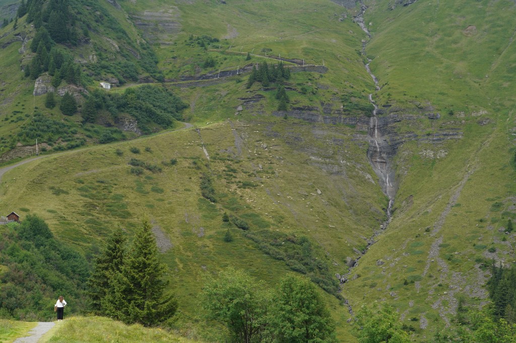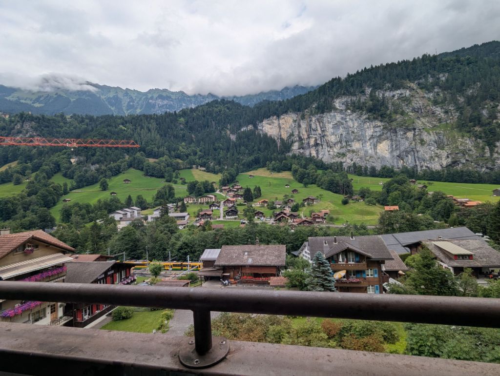 Our hotel room was ready so we lugged our stuff up the 4 flights of stairs and relaxed in the room and on its balcony for a while. We had dinner reservations with Cathy back up in Gimmewald so we decided to take a different route up to Murren and do some last looking around before. This trip involved a cable car from near our hotel in Lauterbrunnen and then a train along the top of the cliff to Murren.