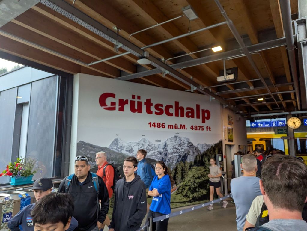 At the Birg station they have 2 “thrill” areas. One is a viewing platform that sticks out over the cliff and has a mesh floor. We all made various attempts to walk out on it and Becky and Sam were the most brave and made it out to the far railing. Becky looked down through the grate just in time to watch a bird fly under her, which was a very strange sensation. Chuck froze about halfway out and then retreated to the concrete steps to watch from there. The second feature that none of us braved is a walkway with a similar mesh or glass floor that wraps around the cliffside around the station. It even has an optional section that we saw from above that has a tightrope and a net under you can try and cross. The steps we decided to watch from looked out towards the big 3 mountains and we got to see their peaks 1 or 2 at a time as the clouds flowed past and it was sun just relaxing and watching the view.