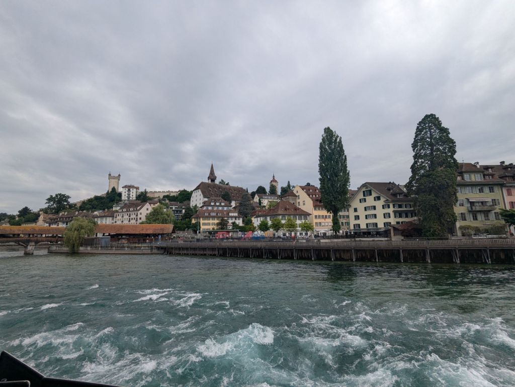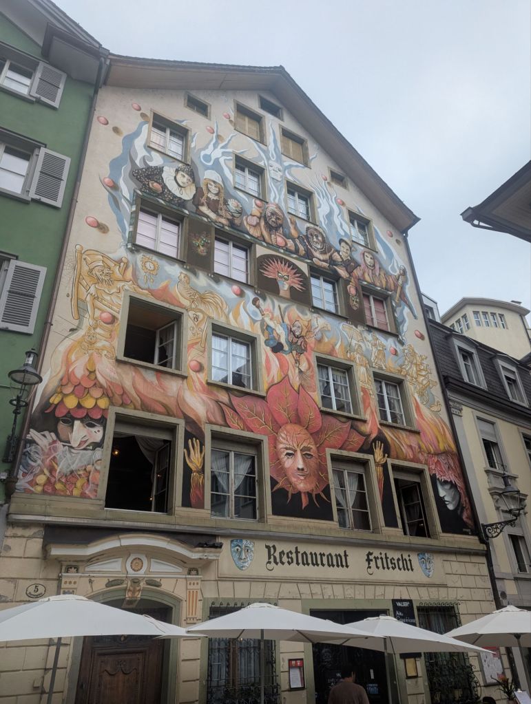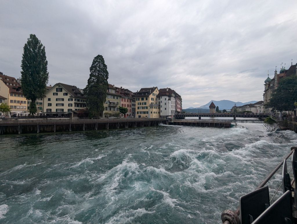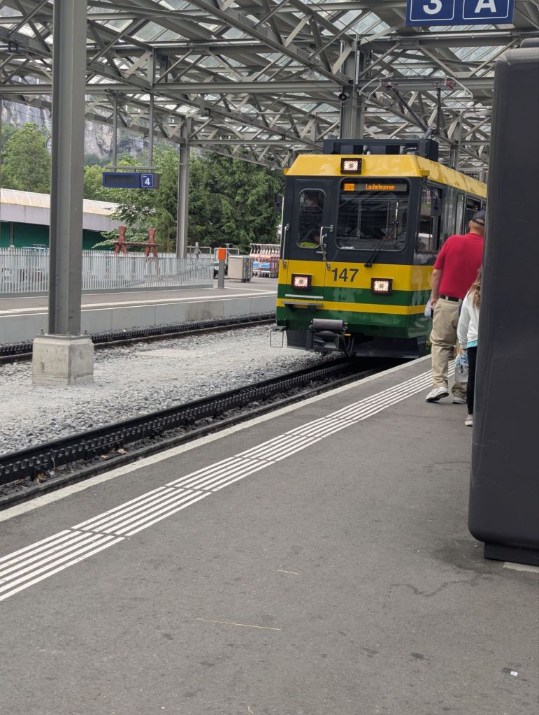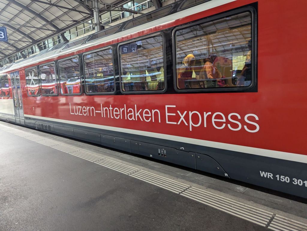 This morning proved to be another one of those mornings that builds resilience, a key mental health benefit of travel. Our plan was to catch the 9:30 am train from Lauterbrunnen to Interlaken, where we would change to a train to Luzern. Unfortunately, there was rail construction between Lauterbrunnen and Interlaken which meant that leg of our journey consisted of two trains and a bus. And sadly, that leg of the trip is already pretty crowded and chaotic, so we were wedged into our trains and bus with many other bedraggled, confused, and grumpy tourists. Nevertheless, we made it to Interlaken where we said goodbye to Cathy and Sam and boarded our blessedly peaceful train to Luzern.