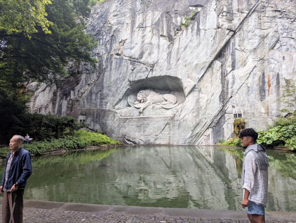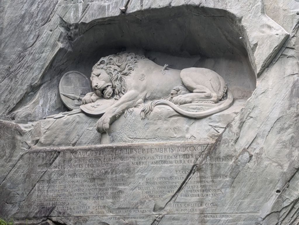 The transport museum itself was fun and very interactive. Unfortunately, we had to rush through the exhibits a bit because we arrived a little too close to closing time. Nevertheless, it was fun seeing exhibits on so many of the modes of transportation we’ve utilized so far on our trip, as well as their predecessor versions. After the museum, we headed over to the Lion Monument, a memorial for the members of the Swiss Guard who died attempting to protect the French King Louis XVI and Queen Marie Antoinette during the French Revolution. We went. We saw. We checked it off our list and headed back to our hotel to drop off all of our chocolate and make a plan for dinner.