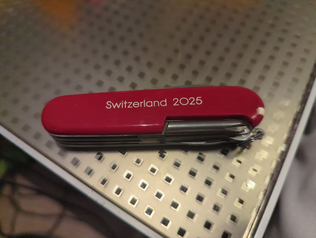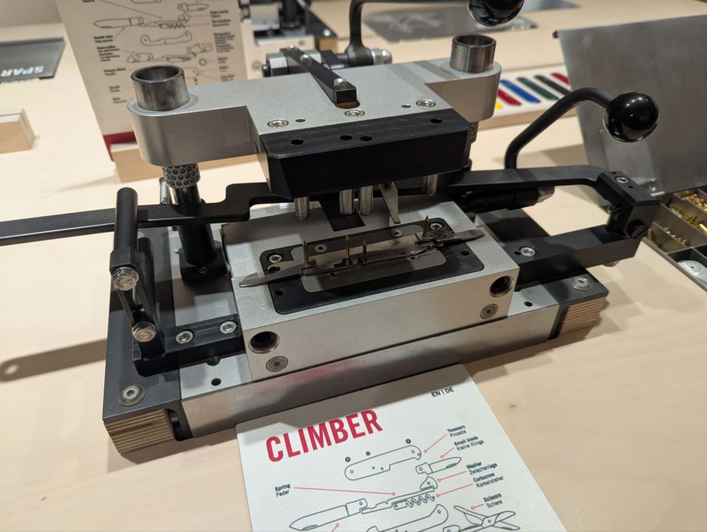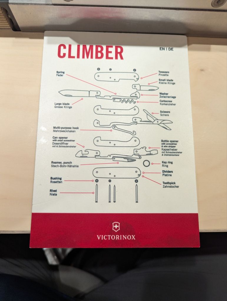At 9 the store opened and I was the first appointment for building a knife. The lady who ran the process was very nice and walked me through selecting 1 of 3 types of knives I could build. I chose the Climber. We setup the machine and started layering on all the rivets, separators, springs and tools and about 20 minutes later I had the knife built and just had to choose the “scales” or the colored outer shell. I chose a travel themed one and had the back side inscribed with “Switzerland 2025” to commemorate the trip.