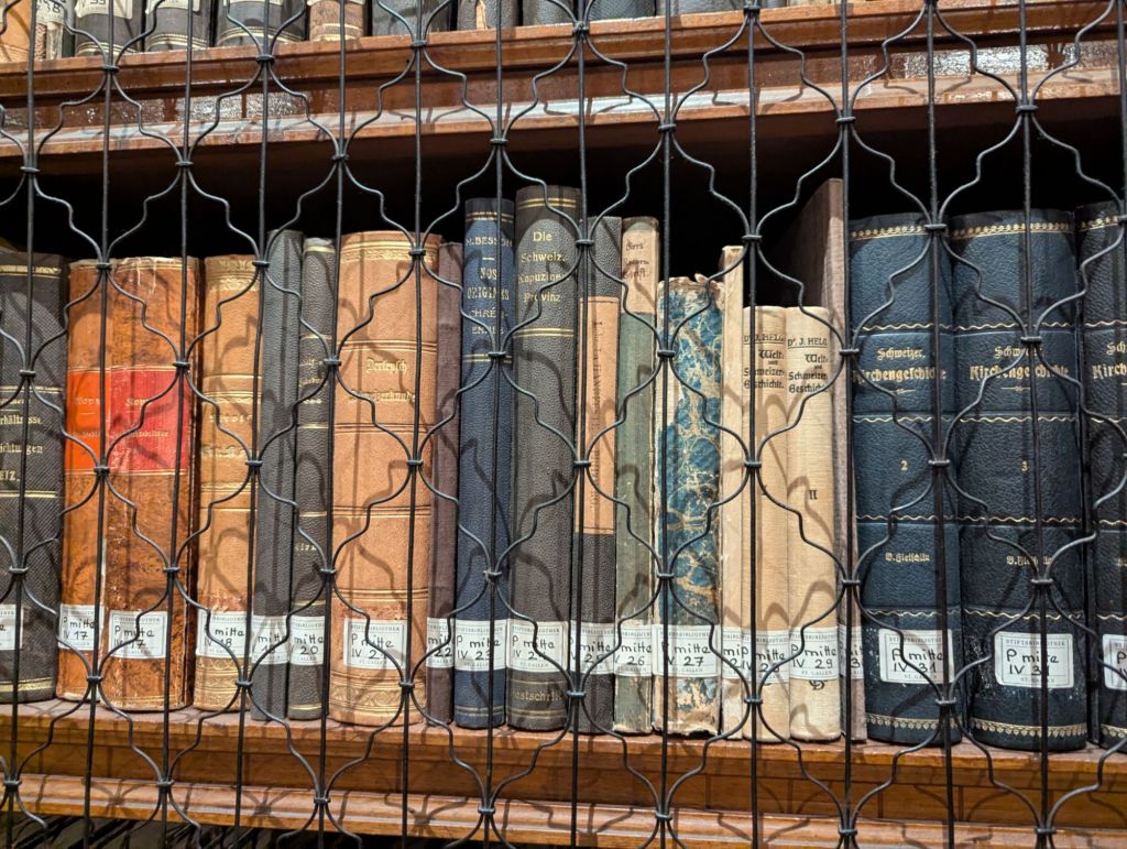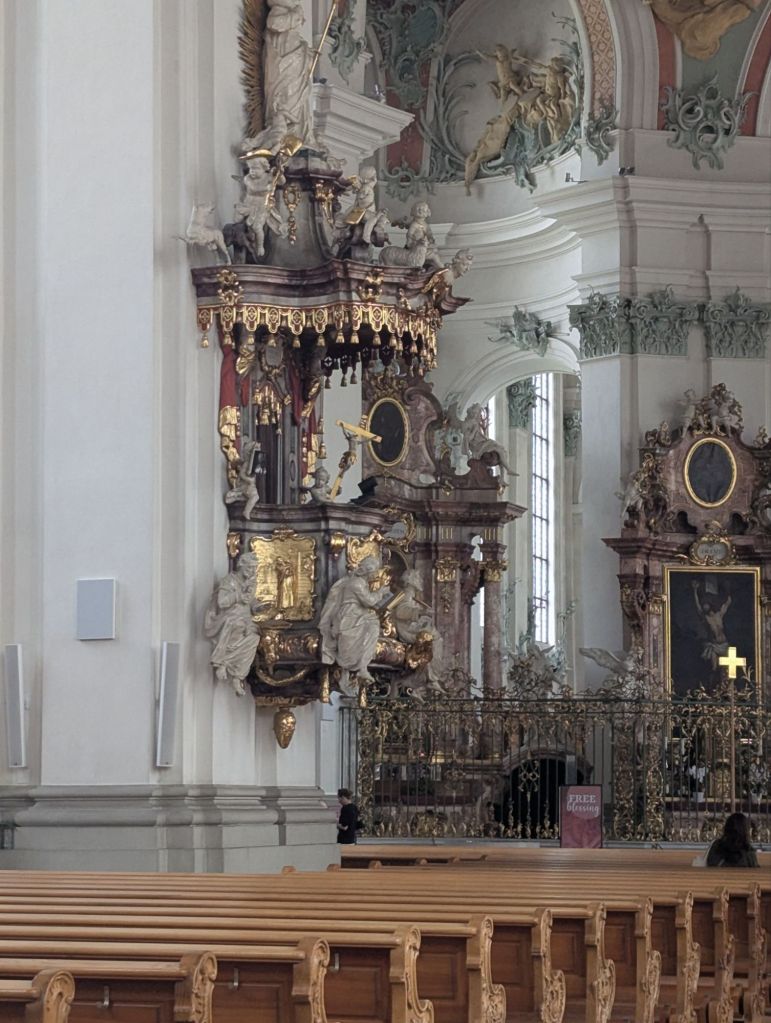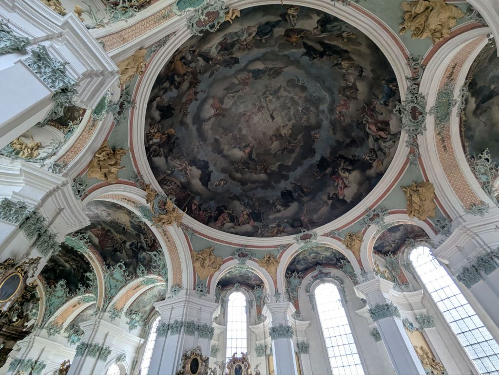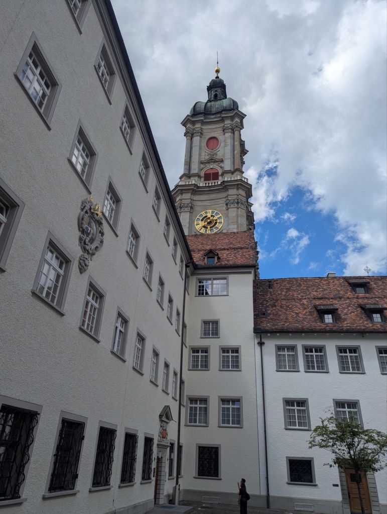 We caught the first train to St. Gallen which was on the Voralpen Express and it was relatively straightforward. We decided to tour the Abbey that St. Gallen is known for so we dropped our luggage in the lockers at the station and headed over that way. The abbey was built in honor of Saint Gallus and we first went through the main cathedral which is an amazing Rococo style interior with vivid and detailed ceiling paintings. We walked through and admired the views and then moved to find the Library. The library was the part Becky was most looking forward to and it did not disappoint. We had limited time but we did an audio guide tour of the library which is an impressive 2 story collection of old manuscripts, maps, globes and even a mummy complete with inner and outer coffins.
