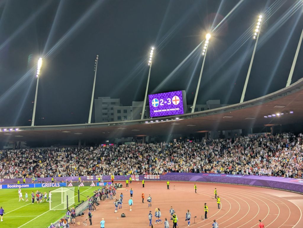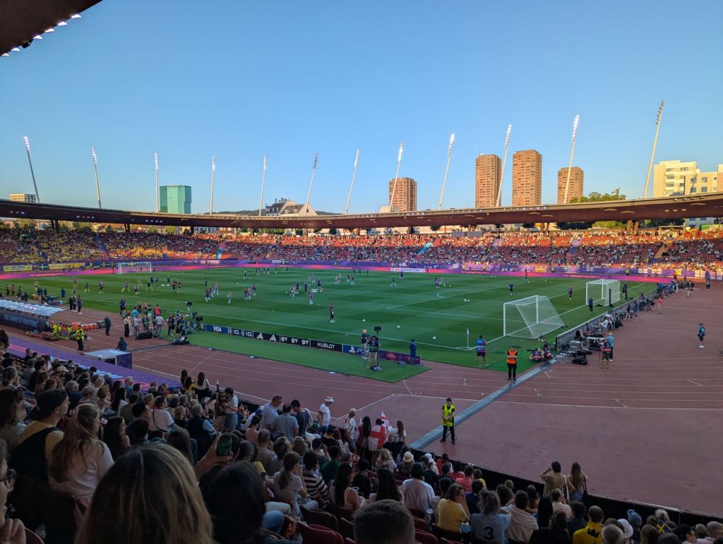 We had tickets to the Quarterfinals and found out several days ago that it would be England and Sweden. Both teams are well regarded in international women’s soccer and we expected a good game. We found our seats in the interesting stadium which had a circular wooden roof over the seats and concourses. The crowds were pretty heavy while we took a lap around to see the food options for dinner and to find some souvenirs. Becky got an interesting combo of a bratwurst and a small crusty bread roll. She tried to make it into bun but it was not ideal. Becky went back to the seats and I went to the Souvenir stand and got a scarf, pin and a Euros mini soccer ball. I grabbed some fries and a drink to take back to the seats and when I got back there were a very nice man and daughter in one of our seats. We quickly resolved that but later when I went to get Becky a water I came back to becky leaving our seat quickly and a bunch of drunk dudes sitting in them. I asked her and she said they had confronted her and 2 women sitting next to us and said we were in the wrong section and started filming the 2 other women during the confrontation. We found an usher and showed them our tickets to verify that we had understood our section correctly (we had) and I immediately went down to put them straight but they had apparently sobered up enough to realize they were wrong and were moving. I let them know it wasn’t appreciated but they were drunk and just laughed it off but at least moved.